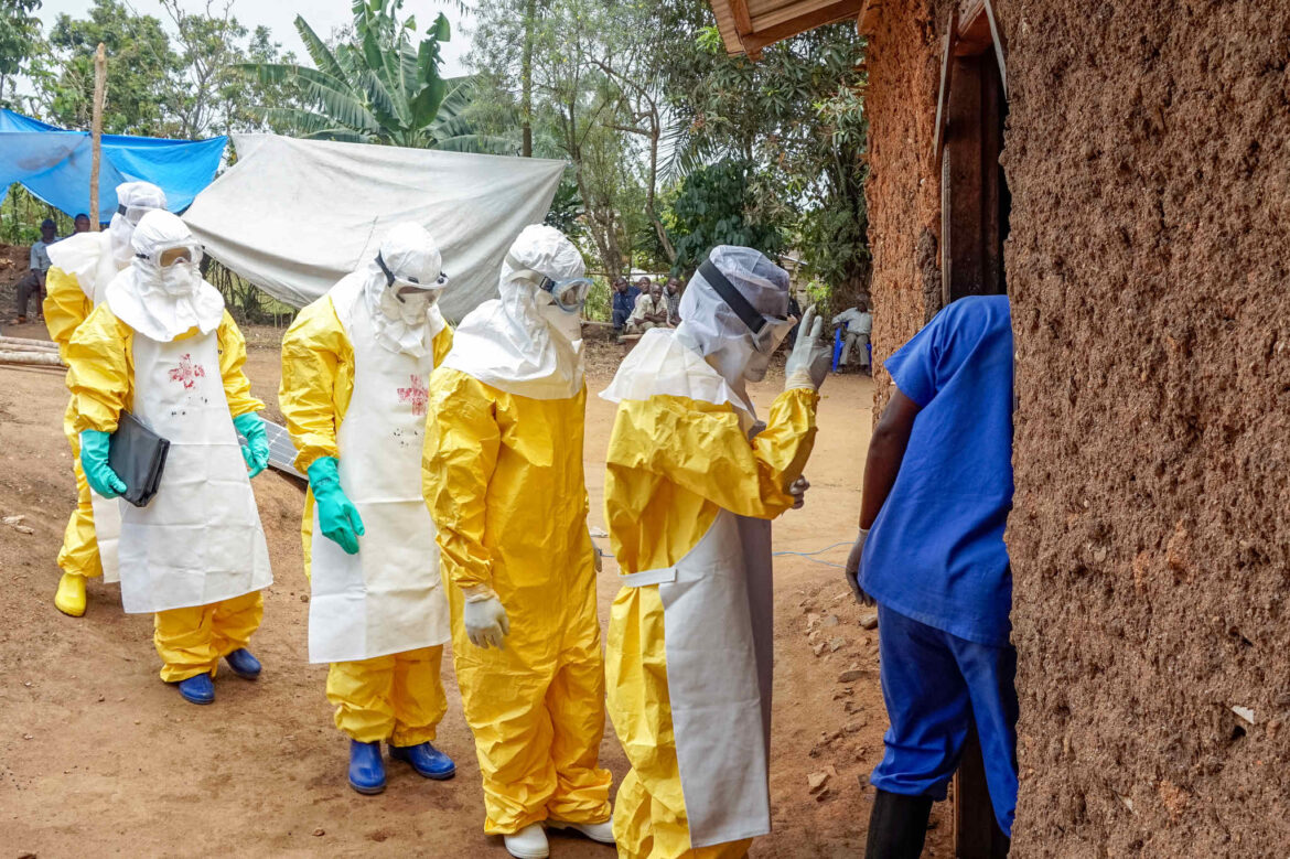 (Pascaline Kavuo Mwasi Saambili, GPJ Democratic Republic of Congo) In March 2019, Ebola response team members prepare to enter a home where a man died in Democratic Republic of Congo. The outbreak in DRC later spread into Uganda, highlighting the complex regional challenges of containing the virus, coordinating cross-border health responses, and navigating local customs during public health emergencies.